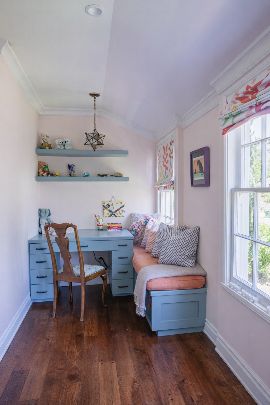 This redesign also created a cozy brand-new bedroom for one of the twins. Now all three children have a space to call their own. This charming room reflects her yearning to curl up and read and showcases her diverse talents and trophies.