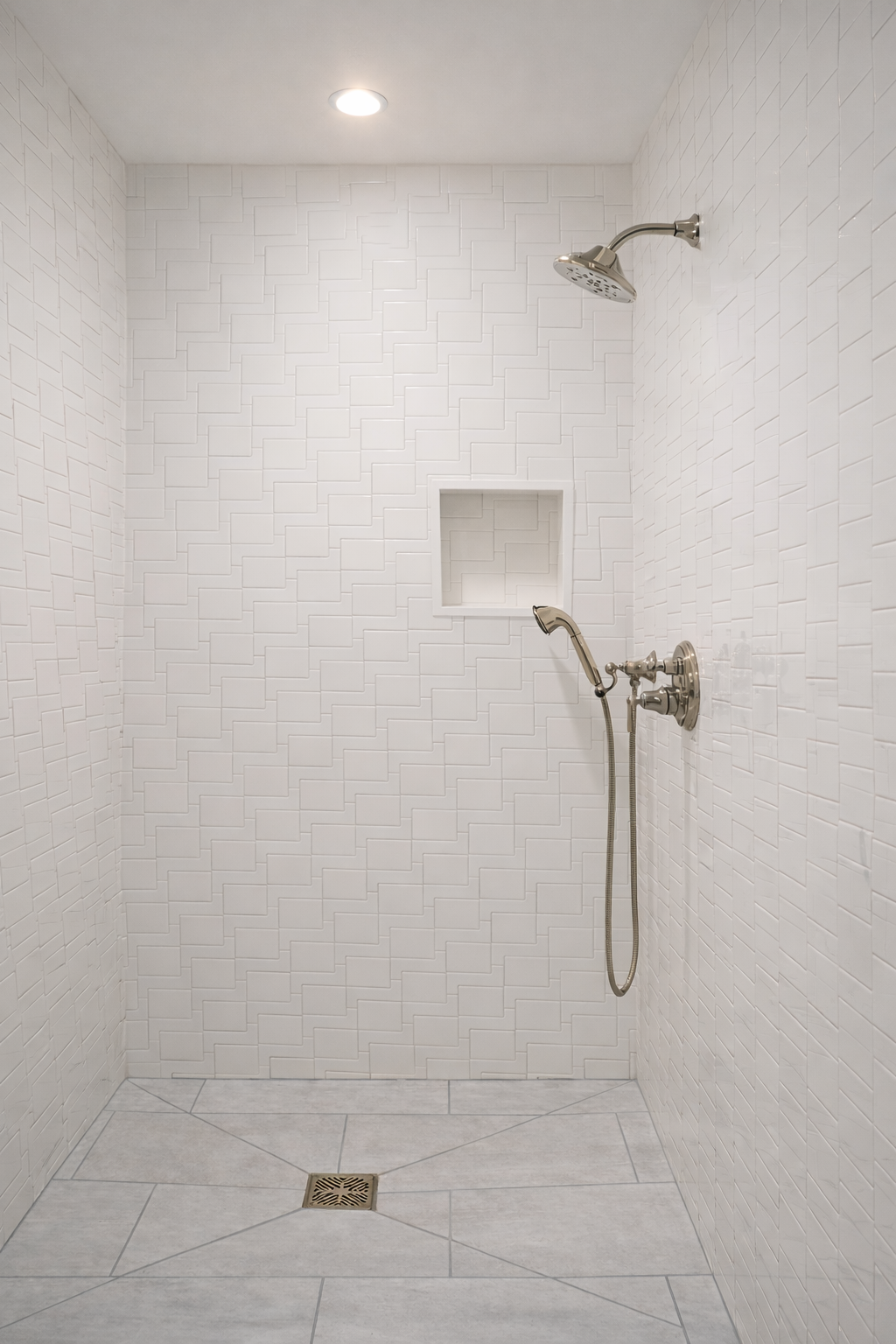 Their eldest son scored his own bathroom with a walk-in shower. We used tone-on-tone white designer tile for a polished yet playful look. Custom cabinetry makes beautiful use of every cubic inch in the tight space.