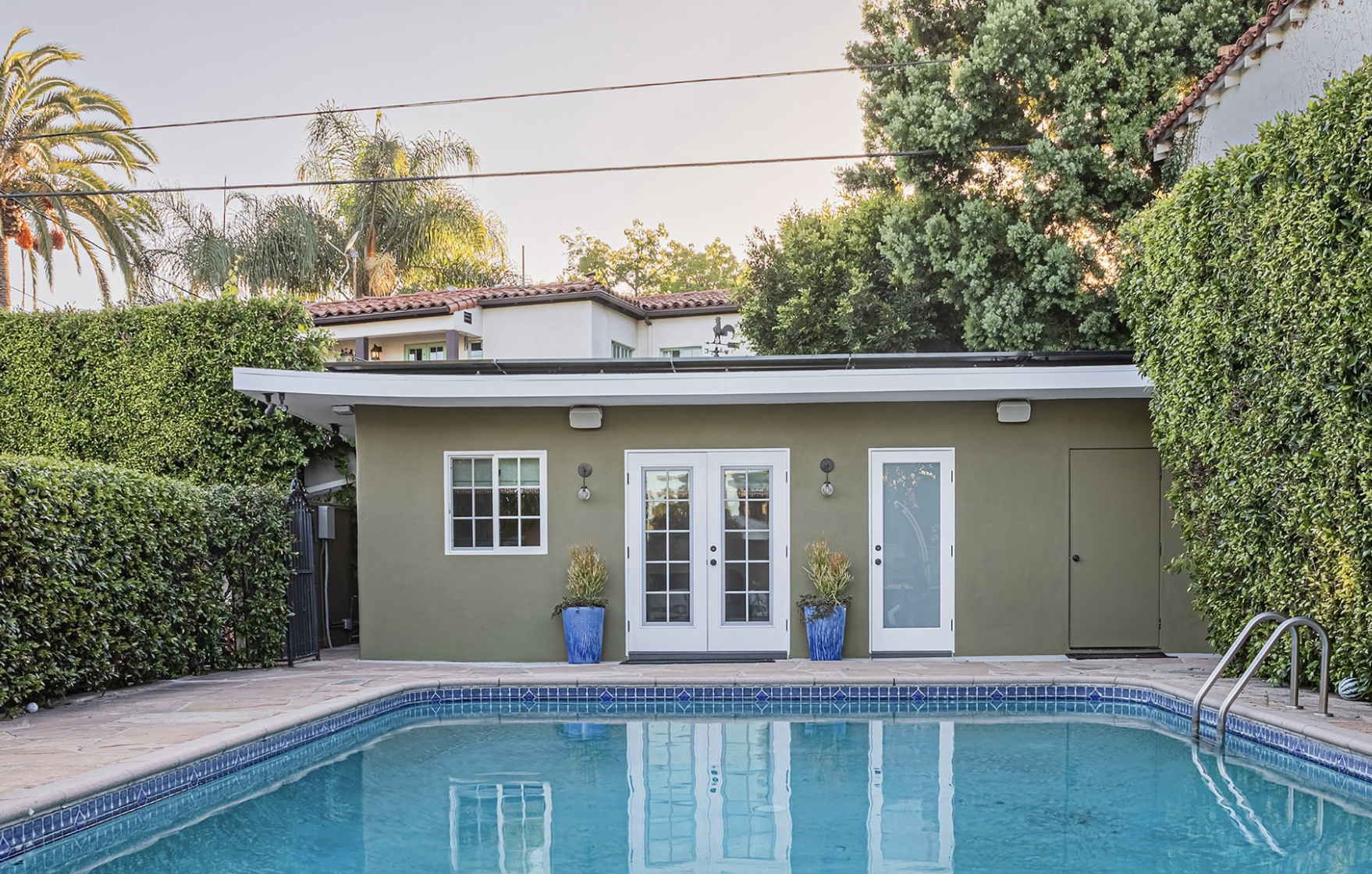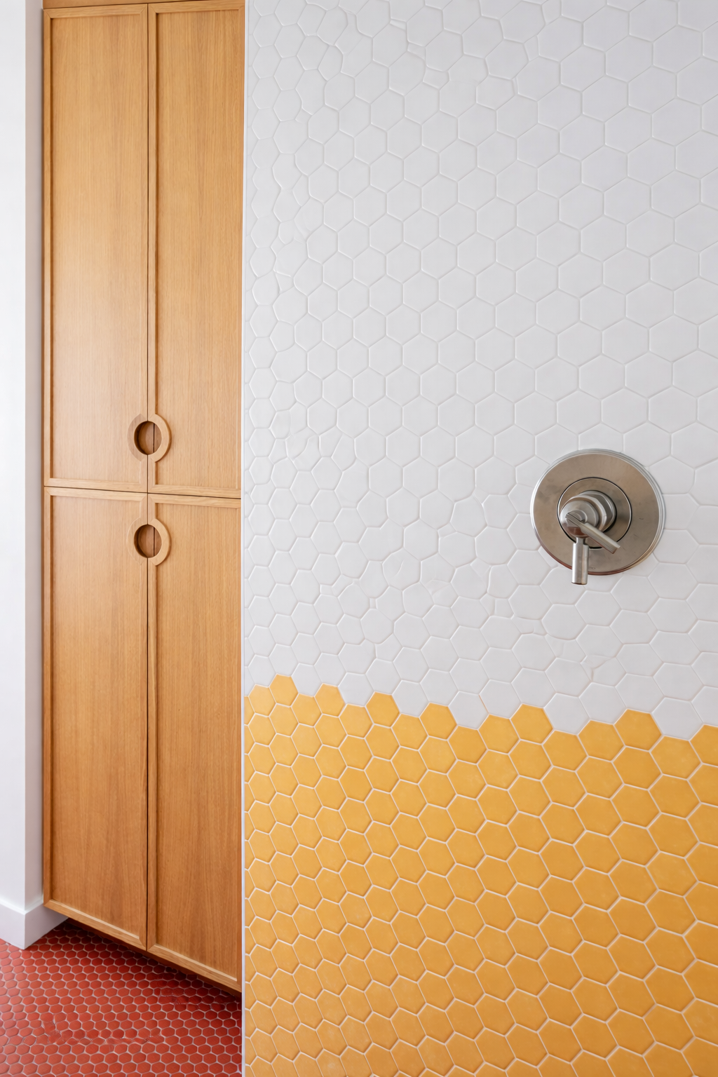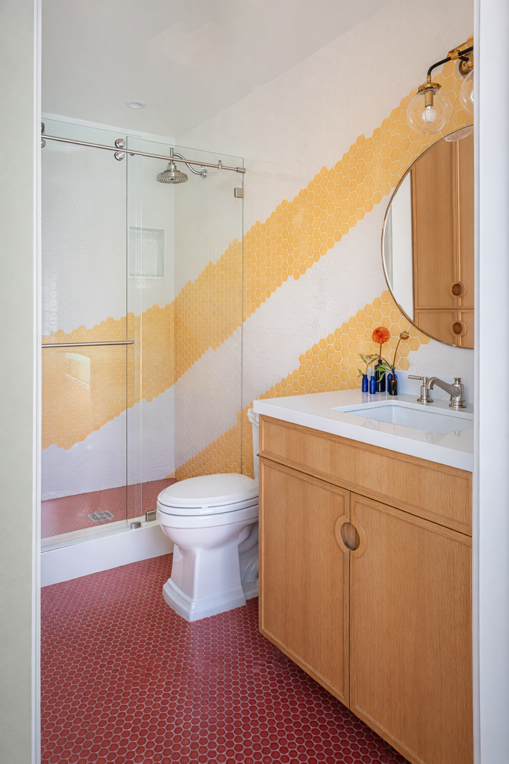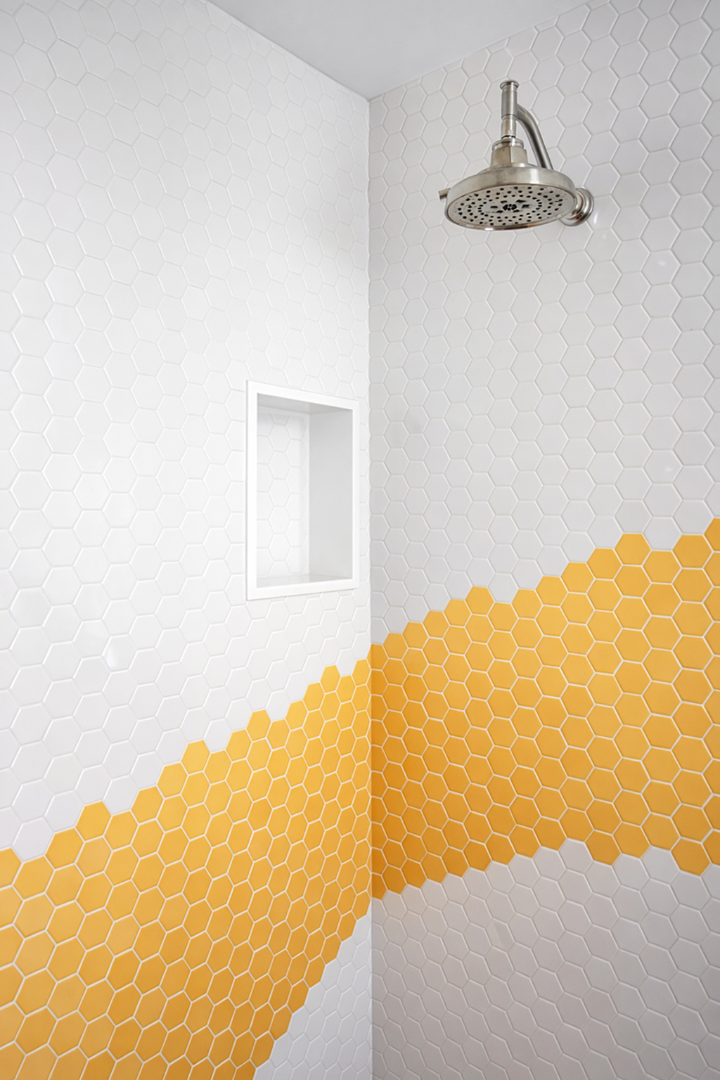 Achieving the look of sunbeams across this new poolside bathroom using an original pattern of Dal Tile’s hexagon ceramic tile.
